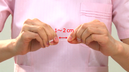 1回の使用分のフロスをケースから取り出し、左右の中指に2〜3回巻きつけ、指と指の間を1~2cmの長さにします。1回の使用分は40cmくらい。指の先からひじまでの長さが目安です。
